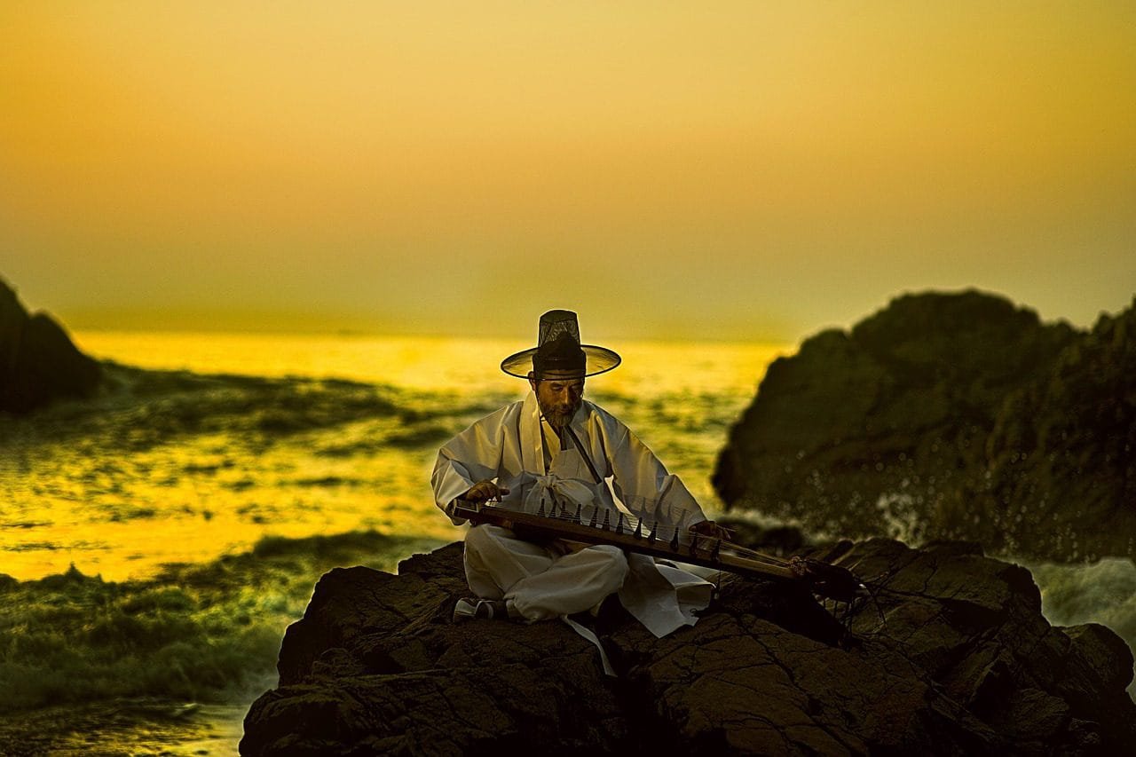 A man in traditional Korean clothing is playing the gayageum, a traditional instrument, on a rock by the seaside.